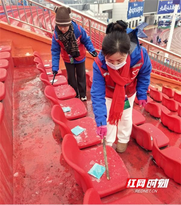 服务期间,从座位的挥铲除冰到取水点的免费递水,到观众通道的耐心引导……每一帧画面都展现着这支团队的多面风采。